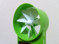 2つ目は風力発電で、この機能が「KINESIS K3」の最大の特徴でもある。発電用の風車は7枚羽根のタービン型ファンで、製品上部の整流ダクト内に設置されており、見た目にもなかなかカッコ良い。いかにも発電しそうな雰囲気を醸し出すこのファンは、とても軽く、柔軟なプラスチック素材で成型されており、軽く息を吹きかけるだけでくるくると良く回る。
