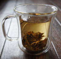 | 丸くまとめられた茶葉が広がるタイプのジャスミンティを入れた様子。これは全部茶葉なので今ひとつぱっとしない絵になってしまったが、工芸茶、花茶などと呼ばれる種類のお茶ならかなりきれいだと思う |