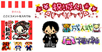 「成人式特集」では、1月11日の「成人の日」に多く行われる成人式を題材にしたデコメ用素材を提供する。「祝!成人!」「成人式」といったテキストとイラストをあわせたものや、袴や振り袖、スーツを身につけたキャラクターのデコメ用テンプレートや画像、絵文字画像が用意される。