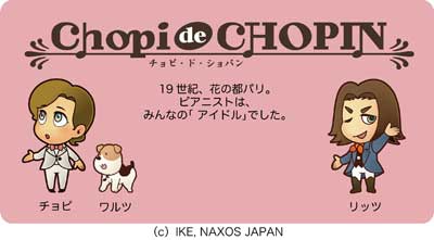 ナクソス・ジャパンは、クラシック専門の携帯電話向け着うたフル配信サイト「クラシックエッセンスフル」で、ピアニスト/作曲家として活動したフレデリック・ショパンとフランツ・リストを題材にしたキャラクターのコンテンツを配信するコーナー「Chopi de CHOPIN」を開始した。