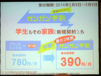 KDDIでは、春商戦に向けて学生を中心とした商品およびサービス展開を図る。料金面では、2009年8月のガンガントーク(指定通話定額)、11月のガンガンメールに続く第3弾として、「ガンガン学割」キャンペーンを発表。キャンペーンは、学生が「プランEシンプル」と「誰でも割」を組み合わせて契約すると、最大3年間、毎月の基本料金が月額360円になるというもの。さらに、学生だけでなく家族についても月額390円(新規契約のみ)になる。湯浅氏は、「業界で初めて学割(ガク割)を導入したauの新たな施策」とアピールした。