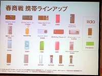 春商戦に向けた端末は、昨年、冬春商戦向けモデルとしてすでに発表されている。湯浅氏は、7色のカラーラインナップで、防水、おサイフケータイ、ワンセグ、5メガカメラ搭載というシャープ製「SH005」を紹介したほか、学生に人気の高い高画素カメラ搭載モデルとして、「SH006」「CA003」「S001」などのラインナップも披露された。