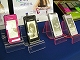 | シャープの中国向け新機種。左からソーラーパネル搭載のSH6230C(Blue、White)と、メモリ液晶搭載のSH6220C(Pink、Black)、SH6228C(Pink、White) |