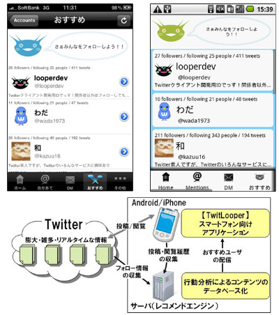 「TwitLooper(β版)」は、ユーザーの趣味嗜好に近いユーザーをおすすめしてくれるTwitterクライアント。フォローやリツイート(RT)、お気に入り登録などの情報から趣味嗜好に近いユーザーをKCCS側のレコメンドエンジンで分析し、アプリの「おすすめ」コーナーで紹介する。