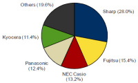 3位と4位は僅差で、2010年に合弁会社となったNECカシオ(13.2%)が、販売が伸び悩んでいるパナソニック(12.4%)を上回った。5位は、前四半期4位の京セラ(11.4%)となった。