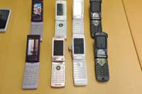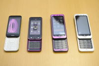 | スライド式で、側面は積層構造をイメージさせるデザイン | 一番左が開発初期の段階。右の2つは製品版。左から右に行くにしたがって、形状やボタンの有無も変化。左の開発段階の2つはテンキー側ボディの縁が反り上がっている |
