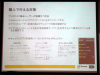 このほか風間氏は、スマートフォンを狙う脅威として、個人情報を取得しようとする傾向は依然として続くと説明した。オープンソースかつアプリ配信環境もオープンなAndroid端末では、Android Marketでアプリをダウンロードすること、ダウンロード件数などを確認すること、アプリインストール時にアプリ側が利用しようとする項目(パーミッション)を確認することの3点に注意すべきという。