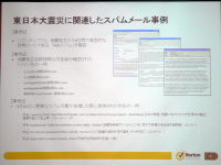 震災以降、チェーンメールなどで誤った情報が拡大する傾向も見られた。メールのほか、ソーシャルネットワークサービスでのデマも見受けられたが、吉田氏は「ユーザーからするとチェーンメールは迷惑メールだが、セキュリティ製品提供事業者からすると、チェーンメールは未承諾メール(迷惑メール)と一緒にしておらず、チェーンメールに対してフィルタを作成し、ブロックすることはない。ソーシャルサービスで誤った情報が拡大する、ということ自体は震災以前から見受けられる。またユーザーが多いサービスではスパムも増加傾向にあり、ユーザーでの注意も必要だろう」とした。