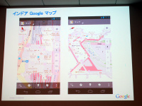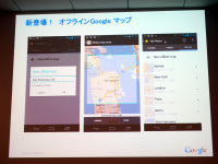 なお、米Googleは、地図データを保存して利用するオフライン利用が可能なGoogleマップの新サービスを発表している。しかし、今のところ日本ではこの機能は使えない。このサービスは、Googleが独自に作成した地図データをキャッシュできるというもので、他社から地図データのライセンスを受けてサービス展開しているエリアでは利用できない。グーグルでは日本での展開について「話せる段階にない」とコメントしている。発表会の中で後藤氏は、「海外とは異なり、日本ではほとんどの場所で電波が入る。海外旅行に行った先で出発前にキャッシュしておいて現地で使う」などと利用方法を説明していた。