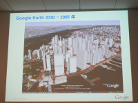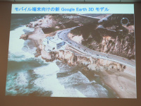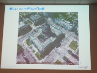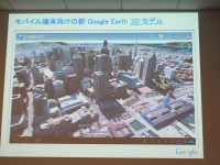 グーグルのプロダクトパートナーシップ本部マネージャーの村井氏は、現在開発中のモバイル向けGoogle Earthの最新動向を発表。「グーグルは、3D化することで地図は高度化すると信じている」と語り、新たな3Dモデリング技術を取り入れたGoogle Earthを紹介した。