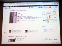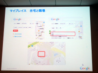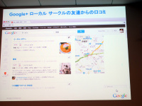 グーグルのプロジェクトマネージャーである村上陽祐氏は、Googleマップを生活の中での利用方法を具体的な形で紹介した。SNS「Google+」を利用して、地域と食べたいものを検索し、外食情報に詳しいユーザーが「Google Place」に掲載した店舗レビューをチェック。そこからさらに、レストランガイド「Zagat」の情報があれば、「Google+」で合わせて確認でき、店内の雰囲気をストリートビューでチェックできるという。