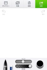 鉛筆やフェルトペンなど27種類のブラシを搭載し、手書きの文字やイラストを描いたり、ブラシで写真に装飾したりと楽しめる。また、地図画像に待ち合わせ場所を記したりといった使い方もできる。ブラシサイズや透明度の設定のほか、写真の拡大縮小など、細かい設定も行える。