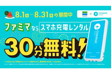 「ChargeSPOT」、8月はファミマで借りると30分未満無料に