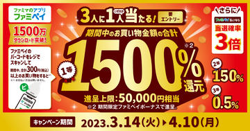「ファミペイ」で最大5万円分還元、1500万DL記念で14日から