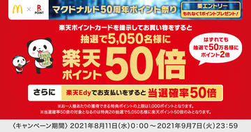 マクドナルドでの楽天ポイントカード提示でポイント最大50倍が当たる、9月7日まで