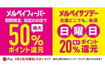 メルペイが対象店舗で最大50%還元のキャンペーン、日曜は全加盟店で最大20%還元も