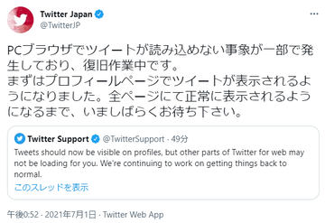 ブラウザ版Twitterで1日午前中に障害発生、現在は復旧作業中