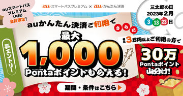 2月の三太郎の日に「auかんたん決済」で3%ポイント還元、スマパスプレミアム会員対象