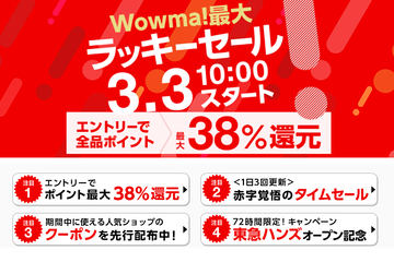 Wowma!で「ラッキーセール」~ポイント最大38%還元、人気商品が最大70%オフ