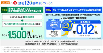普通預金金利が通常比120倍に、じぶん銀行とカブドットコム証券がキャンペーン