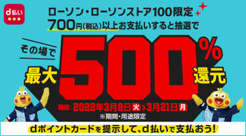最大500%のdポイントが当たる、ローソンでの「d払い」利用で