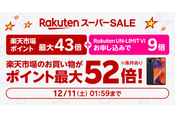 楽天モバイル回線契約でポイント+9倍、「楽天スーパーSALE」との合計で最大52倍に