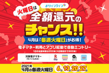 電子マネー情報アプリ「おサイフライフ+」、毎週火曜日に還元キャンペーン開始