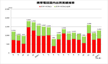 国内メーカーの携帯出荷、1月は前年同月比81.6%の128万台