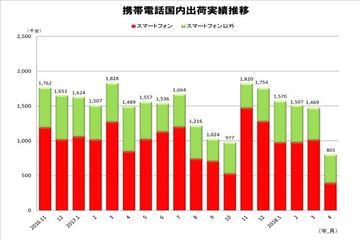 4月の国内メーカースマホ出荷は39万3000台、前年同月の半数以下に