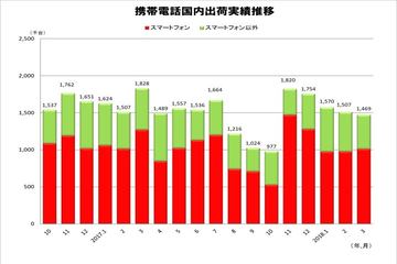 3月の国内メーカー端末出荷は146万9000台、前年比で約2割減