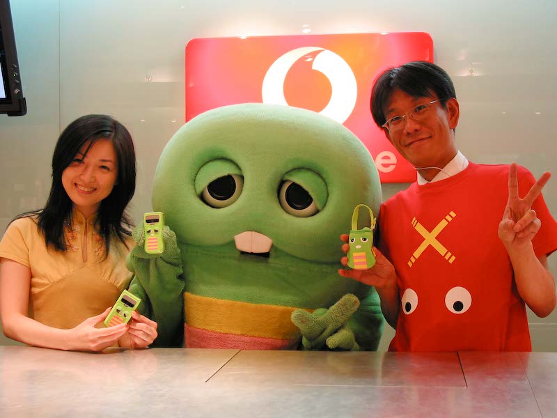ガチャピン(中央)と、本キットの企画をしたボーダフォンの尾方氏(左)、通常時にボーダフォンショップ渋谷店の店長を務める川内雅人氏(右)。川内氏ムックTシャツを着てガチャピン店長をサポートした