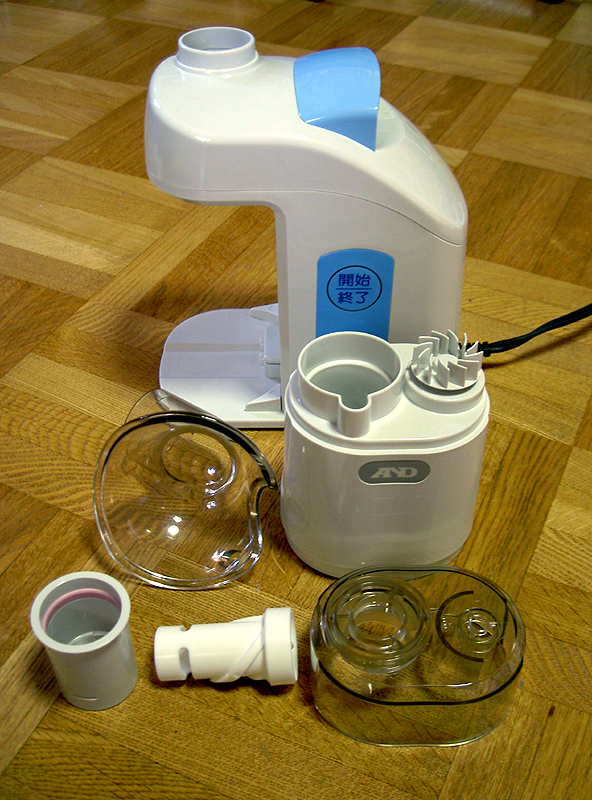 パーツ一式。手前中央の「白い筒」を本体上部の穴へ差し込み、蒸気の偏りや温度調節を行なう仕組み