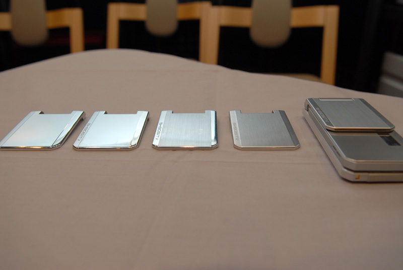 アルミ素材のパネルの製造工程。左から右の順で、ポリッシュ仕上げの後、ヘアライン加工、塗装が行なわれていく