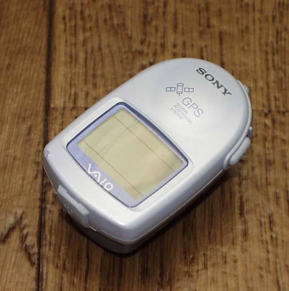 ソニー「バイオハンディGPS『PCQA-GPS3』」。オープン価格、サイズ:44(W)×70(H)×14(D)mm、約40g(電池を含まず)。メモリー:256KB(毎秒記録で3.5時間分)、アルカリ単3乾電池2本使用で、12時間の連続駆動が可能。同等品を含む他パッケージあり。
