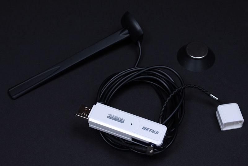 | 付属の高感度外部アンテナ。ちょいテレ8GBのアンテナ端子に接続して使用する。ケーブル長は3mあり、窓際などにこのアンテナをセットするとワンセグを受信できたりすることが多い。吸盤を窓に貼り付け、台座(磁石)をそこに付ければ、高い位置や横向きなど様々な状態でアンテナをセットできる |
