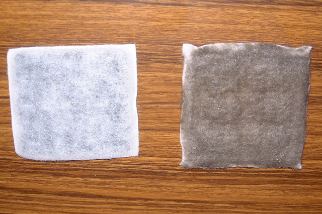 左が使用前、右が使用後のフィルター。1カ月で真っ黒に
