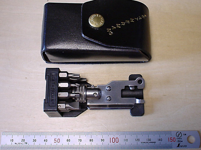 LEATHERMAN TOOLアタッチメントことLEATHERMAN TOOL ADAPTER。アタッチメント本体と数本のビットがセットになっている。専用皮ケース付き