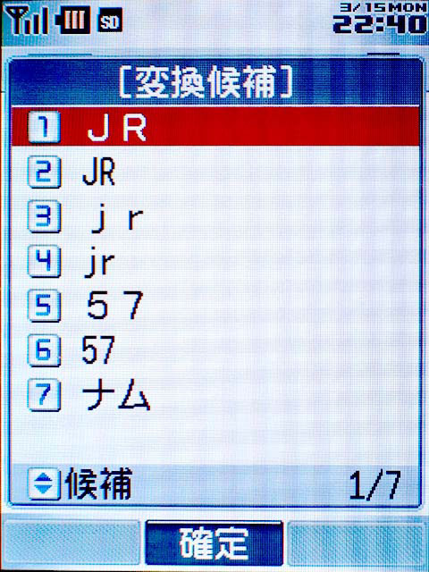 漢字入力モード時、[5][7][7][7]と入力し、英数字変換を行なうと、「JR」や「57」などが変換候補に表示される