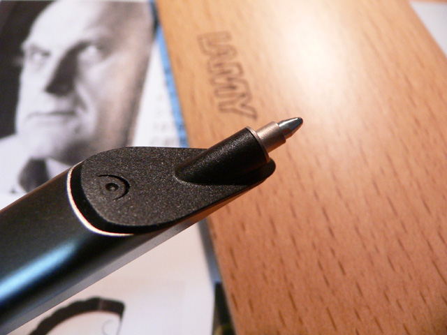 芯交換の方式も普通のボールペンとは違い、丸い窪みを尖ったモノで押すことで、先端部分が全部外れる