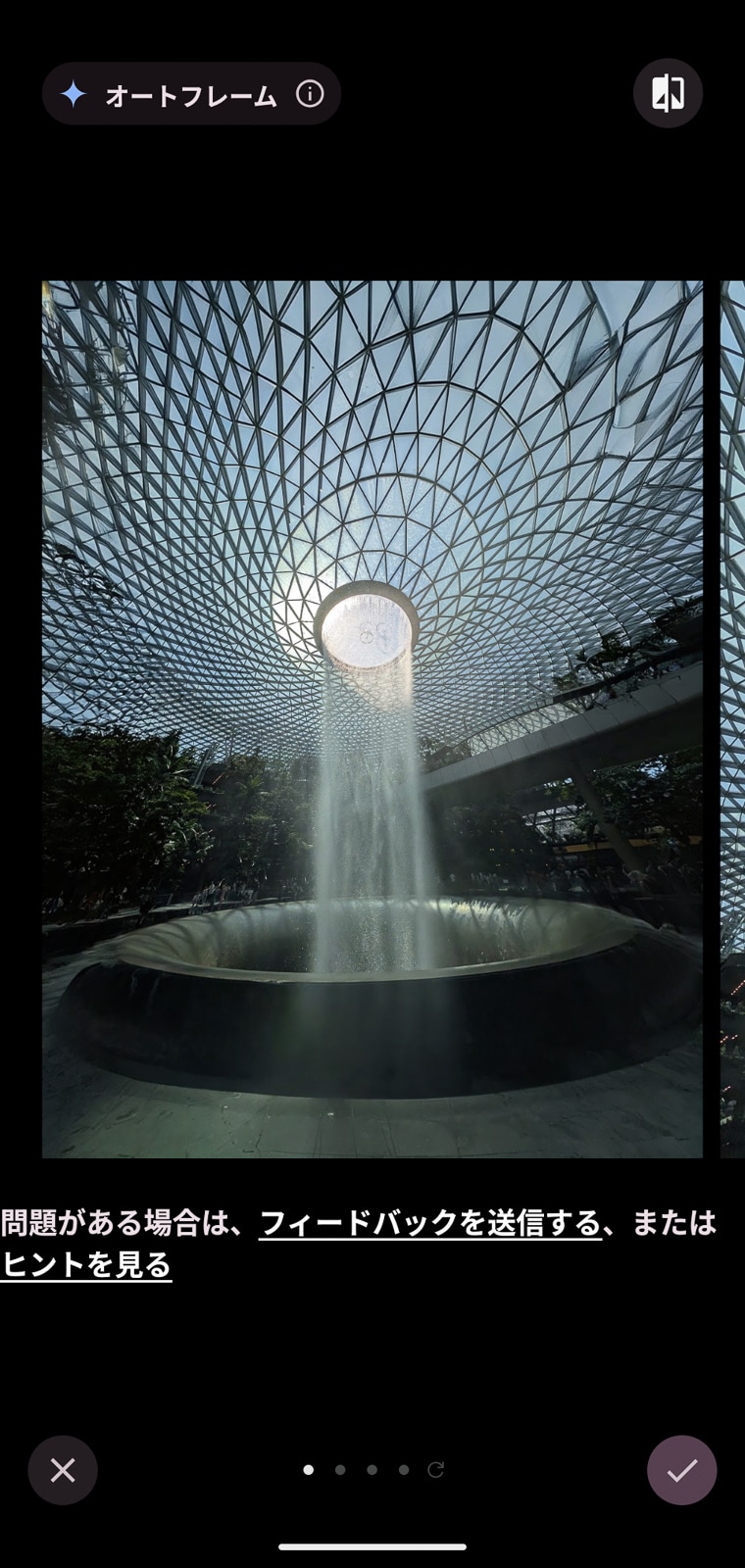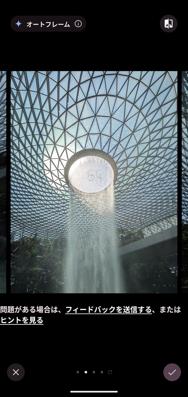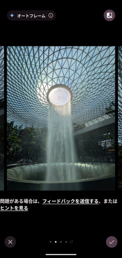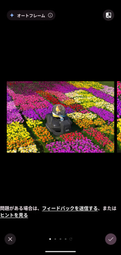 また、「オートフレーム」機能は、写真の構図をAIが分析して複数の構図を提案してくれる機能です。ズームアップする、写真の縦横を切り替える、といった基本的な提案だけでなく、写真に写っていない周囲を生成AIが予測して生成する「生成拡張」で構図を広くするといったことまで提案してくれるようです。