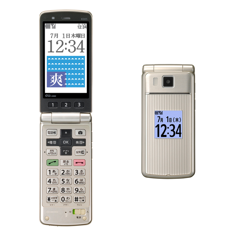 IPX5/IPX7相当の防水性能を搭載した折りたたみ型の簡単ケータイ。基本機能は前モデルである「K004」から大きな変更はないものの、新たに防塵性能(IP5X相当)を備えるほか、テンキー部もより押しやすさに配慮され、凸量(キーの盛り上がり)が高くなっている。「健康歩数計」をはじめ、ワンタッチキーや切り替え式電源スイッチ、「光で操作ナビ」も従来通りサポートされている。