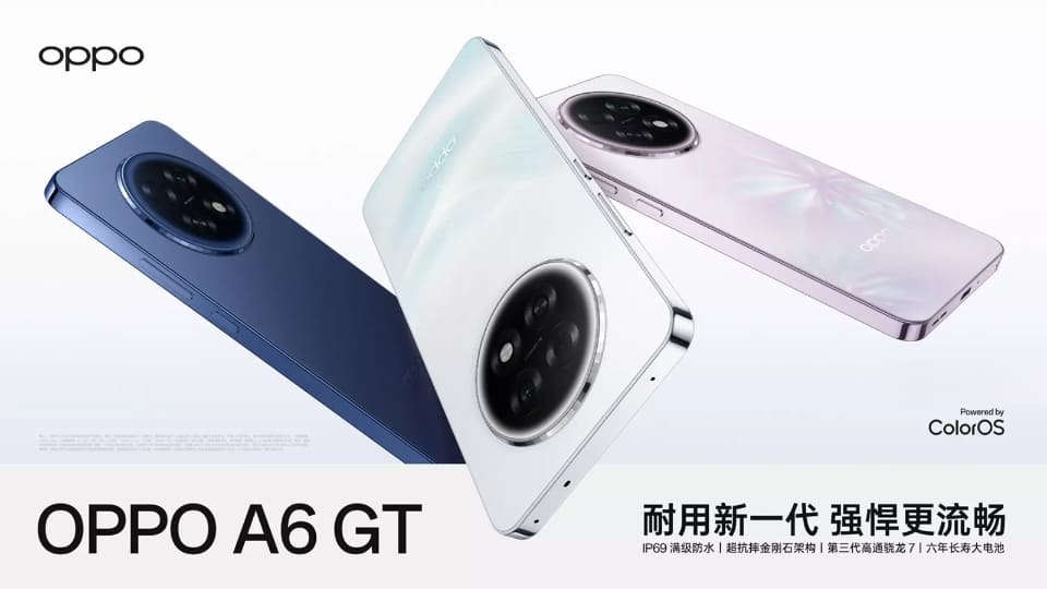 OPPO「A6 Max」と同スペックでカラバリを増やしたモデルが「A6 GT」。ピンク色を追加した3色展開となっているが、性能は全く同じで、メモリ構成が3タイプとバリエーションを増やしている。