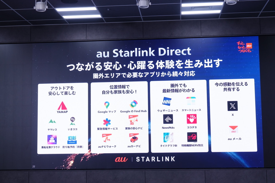 現状を見る限り、KDDIが世界でトップを独走しているため、孤軍奮闘してアプリを集めている感がある。ただ、Starlinkによる衛星とスマホの直接通信が世界的に広がるようになると、対応アプリも一気に増える可能性が高まる。