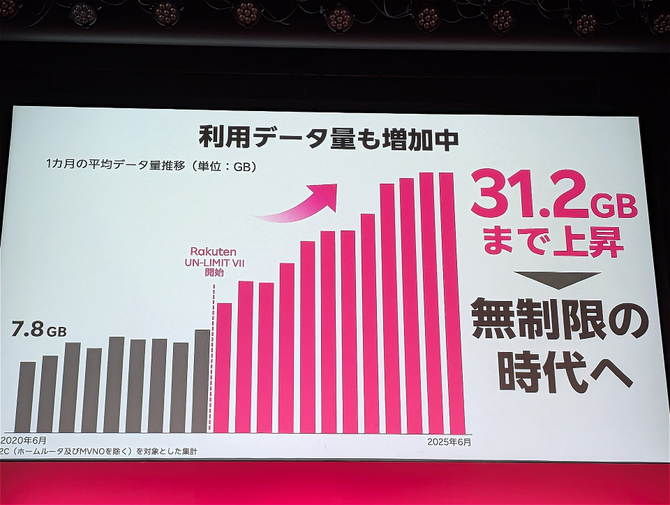 楽天モバイルは年内にも1000万契約を超えようとしている。しかも、一人あたりのデータ利用量は31.2GBと4キャリア平均の倍となるトラフィックを叩きだしている。