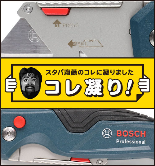 そんな欧米タイプのカッターに新型登場。家電 Watchの記事「都内に電動工具好きの楽園があった!! ボッシュの「ひみつ基地」へ潜入♪」にも書いたんですが、BOSCH(ボッシュ)から欧米でよく見るアノ形の切る工具が発売されたんです。
