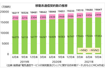 総務省は2021年12月末時点における「電気通信サービスの契約数及びシェアに関する四半期データ」(以下、総務省データ)を2022年3月18日に公表した。