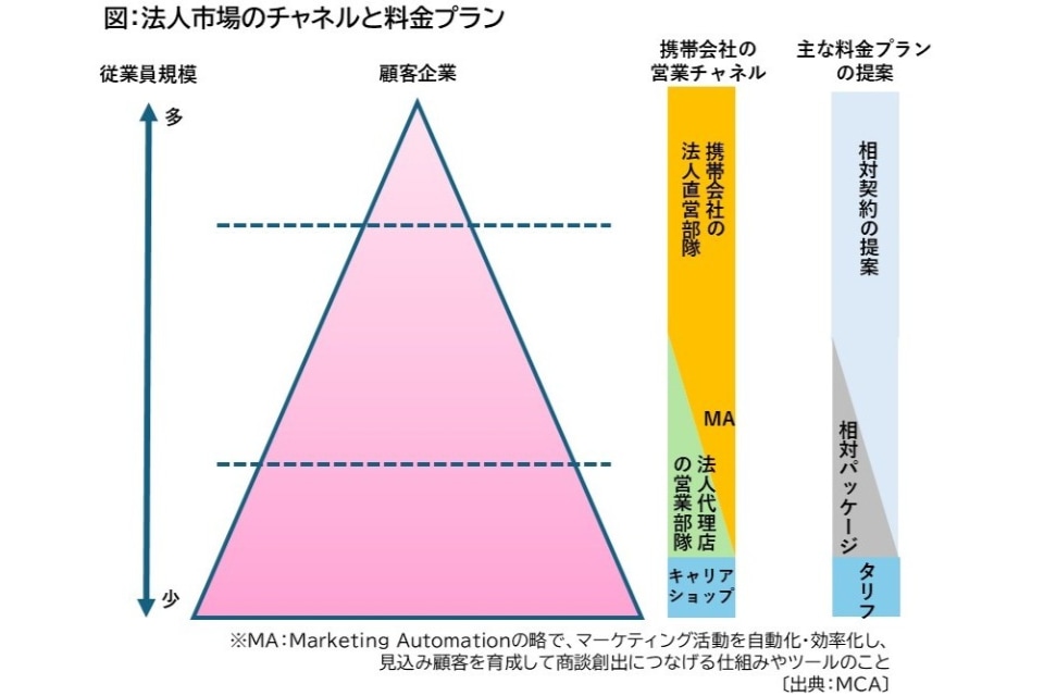 モバイル市場の成熟化は法人も同様だが、大手企業はBCP(事業継続計画)を前提としたマルチキャリアの傾向が強く、IoT回線を除けば、普及しきった状態でオセロのように日々シェアが入れ替わっている。一方、収益性という観点からは、極限まで料金を抑えた相対契約中心の大手企業ほど収益性が低く、タリフで提供するケースが多い中小・零細企業ほど高いとされている。