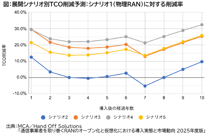 いずれのシナリオも、従来型の物理RAN構成よりTCOは削減しており、結果として、本分析はvRAN/Open RANが長期的なTCO削減に寄与する可能性を定量的に裏付ける材料といえるだろう。