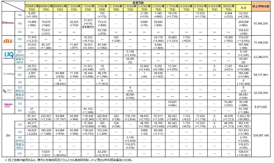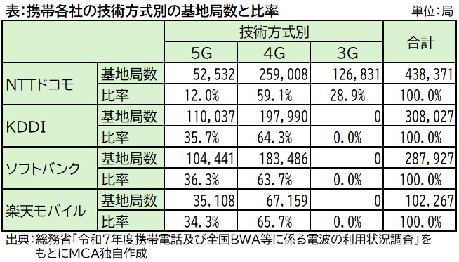 総務省は1月13日に「令和7年度携帯電話及び全国BWA等に係る電波の利用状況調査」の結果を公表した。今回は、同報告書に記載されている携帯各社の基地局展開の状況について、見ていきたい。なお、本レポートの情報は、 2025年3月時点の各社データに基づく点にご留意いただきたい 。
