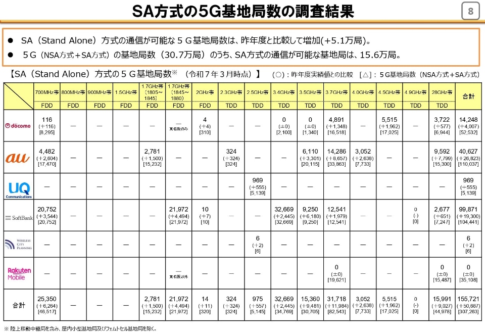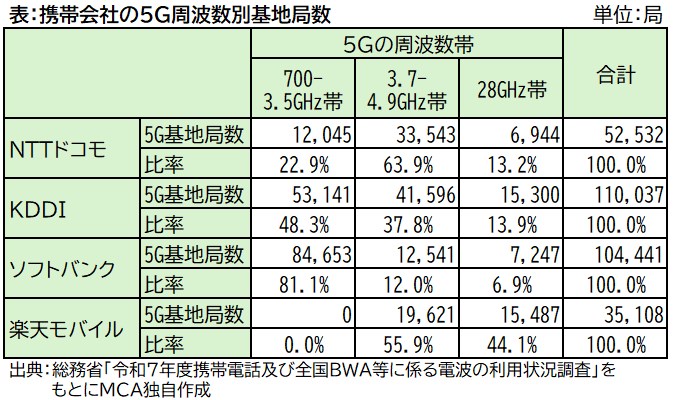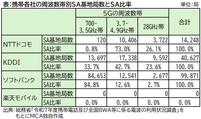 上記グラフを、SA基地局数を5G周波数別に整理したのが下記の表だ。